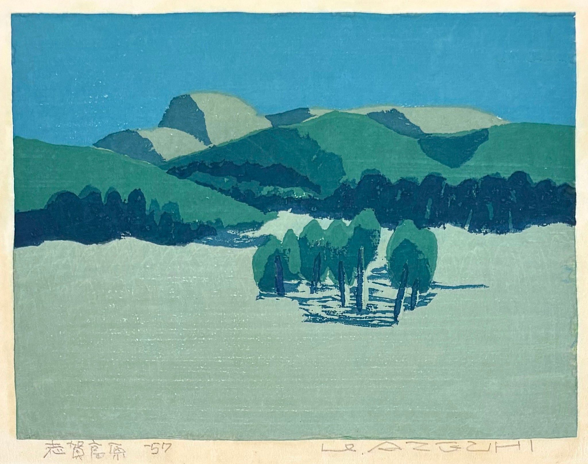 Born to poor farmers in Uwajima in the far-flung Ehime prefecture of Shikoku, Umetaro Azechi (1902-1999) came from a humble background. Securing a job at a government printing company in Tokyo he soon developed a deep curiosity in the art of printmaking. Pursuing his newfound curiosity and passion, Azechi introduced himself to Unichi Hiratsuka, an established artist of the time, and became a member of the Sozaku-hanga print movement. Overtime he gained access to exhibitions, met other artists, and honed his own skills, eventually participating in major print biennales in Sao Paulo, Tokyo and Lugano. An avid mountaineer, Azechi is most famous for his mountain scenes, which can now be found in the Achenbach Foundation in San Francisco, the Art Institute of Chicago, the Boston Museum of Fine Arts or The British Museum in London.