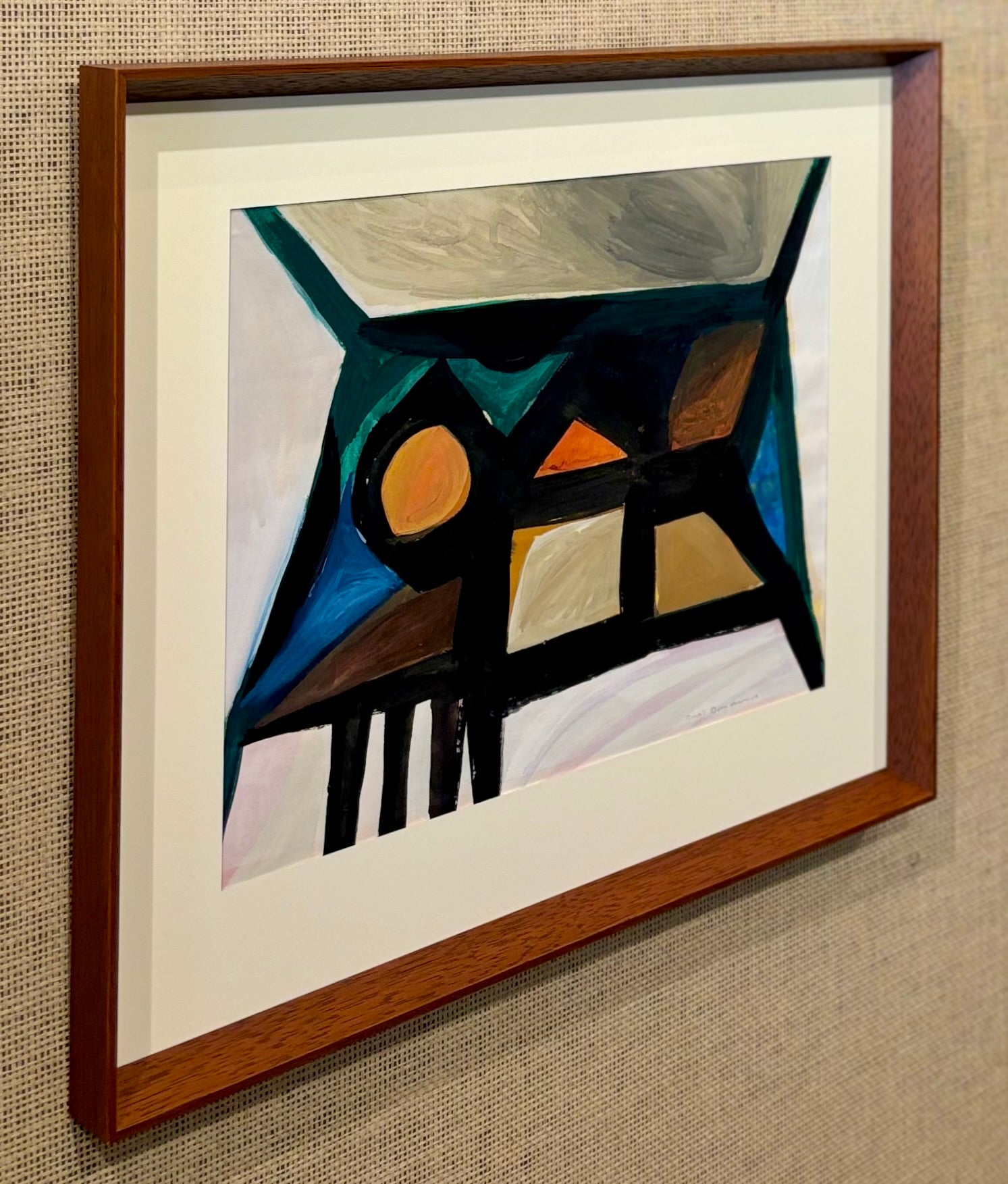 presented in a new angled teak stained timber frame with archival mat and backing and non-reflective UV glass